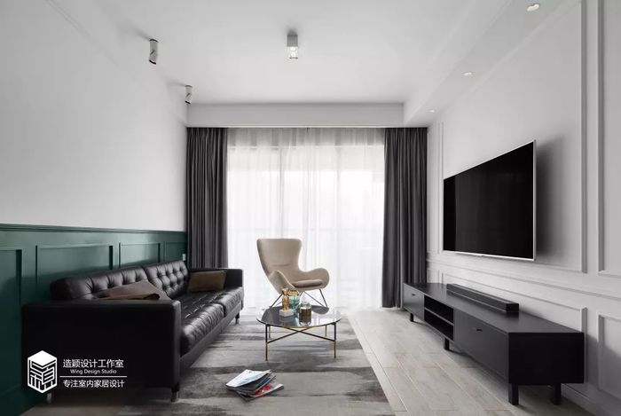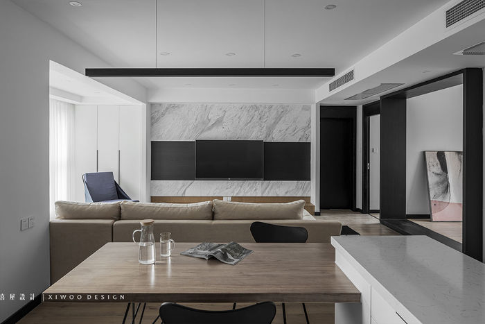 電視墻利用大理石與木材分割錯拼,讓人眼前一亮,而木材的寬度與電視尺寸大小相符,黑色的門框與背景墻相呼應,與淺色的家具形成了強烈的視覺沖擊性,讓空間質感更加明顯。