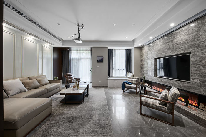 搭配明度和飽和度較低的淺色系布藝沙發(fā),空間的視覺系統(tǒng)顯得統(tǒng)一,質感強烈。