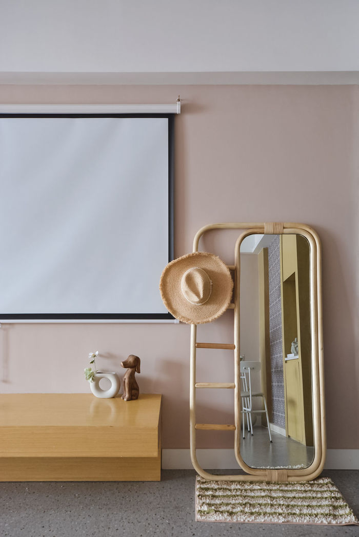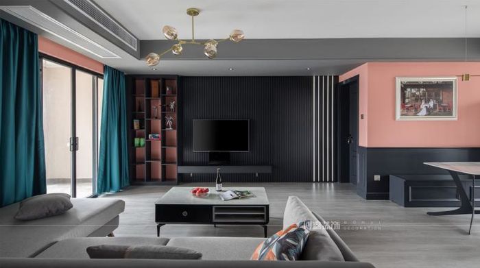 珊瑚紅墻面非常有個性,搭配幾何圖形的黑白電視柜,為整個空間增添藝術質感。偶爾改變一下背景墻,嘗試一下珊瑚紅墻面,給生活有不一樣驚喜。