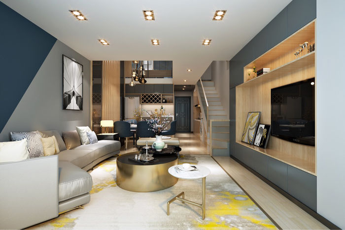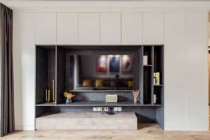 電視嵌入進大面積的深灰色背景墻之中,感覺空間檔次瞬間上升了好幾個level吧?地板色與墻面大理石保持了統(tǒng)一,為避免大面積的深灰色讓空間少了溫馨,所以需要其他亮色系軟裝家視來提升亮度,并做裝飾點綴。