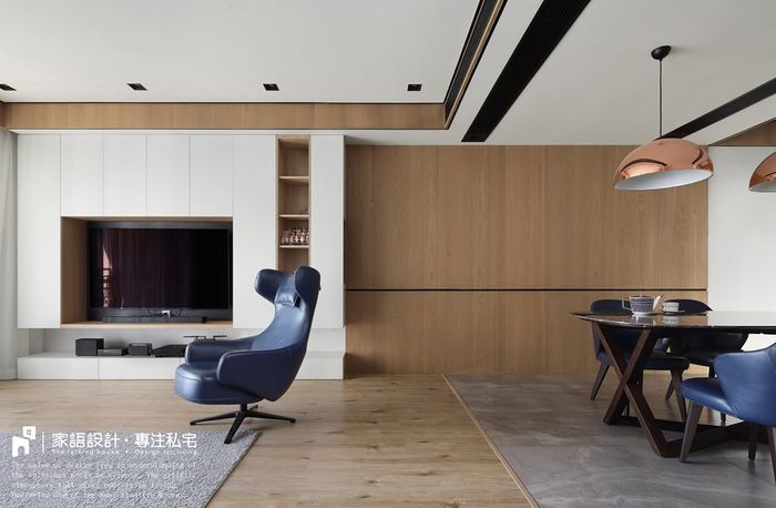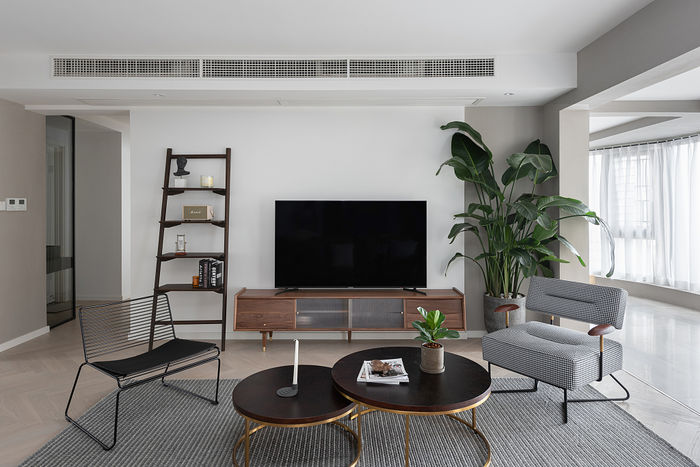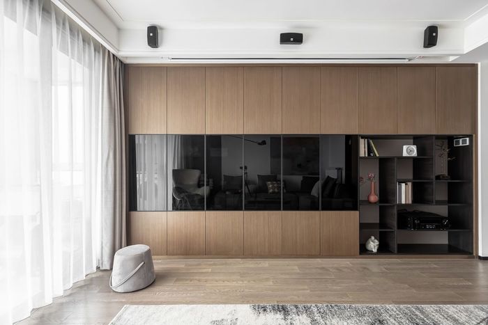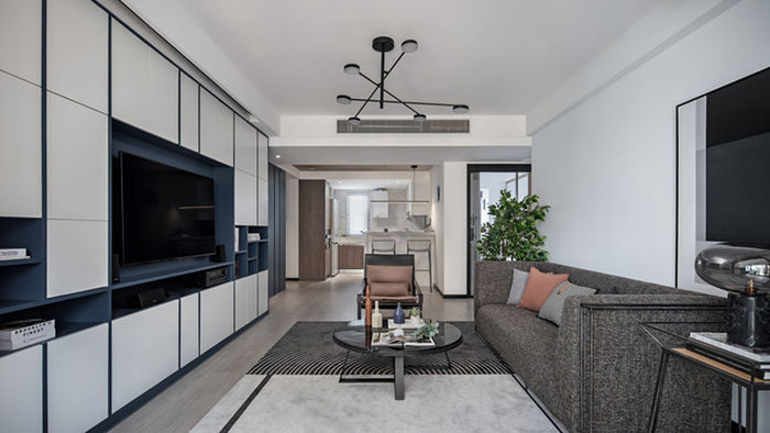 整體色調以黑白為主,底邊的原木柔和了黑白之間的色調。整潔的通頂柜電視墻讓人看著很舒服,以收納為主,在灰色低調中顯示著簡約、自然、輕松的家庭生活。
