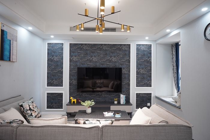 石膏線電視背景墻體現(xiàn)的是一種線條美,如果用兩層石膏線作裝飾,不僅將墻面拉伸,也讓整個背景墻顯得不那么單調,也具有空間層次感。搭配淡淡的藍色顯得十分優(yōu)雅。