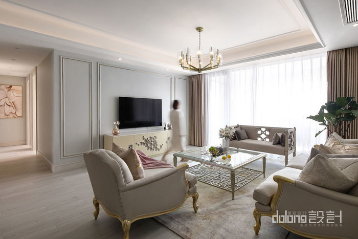 該案例中,中空式的客廳就很適合歐美風格,亮堂的廳室配上美式家具,整個客廳墻面鋪上了大理石,其他空白的墻面用金色與石膏線裝飾,盡顯奢華大氣。